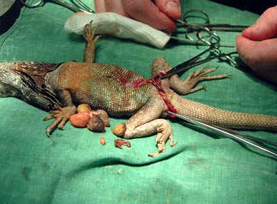 The following 2 images show the surgical removal of pre-ovulatory eggs in a green iguana.